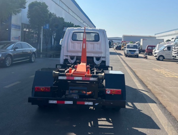 上装配置:高强度合金钢一体式主勾臂,加强型副梁,铸钢尾托轮,有线遥控器带手动操作 ,上装最大提升能力 3000KG, 液压完成上箱+下箱+锁紧+自卸等作业,实现一车配多箱的循环转运。