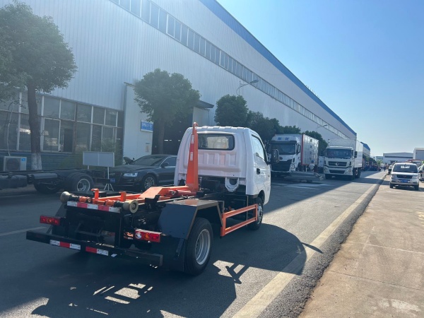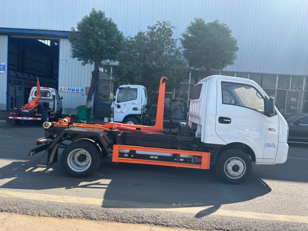 上装配置:高强度合金钢一体式主勾臂,加强型副梁,铸钢尾托轮,有线遥控器带手动操作 ,上装最大提升能力 3000KG, 液压完成上箱+下箱+锁紧+自卸等作业,实现一车配多箱的循环转运。